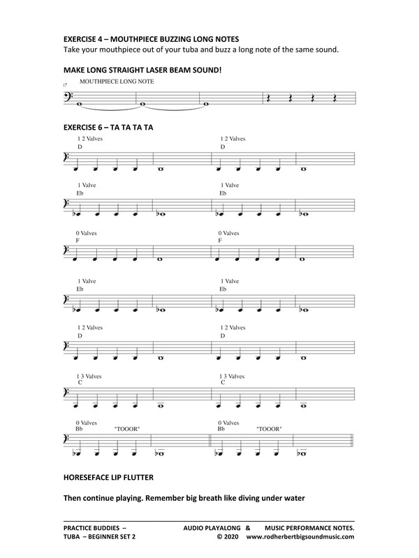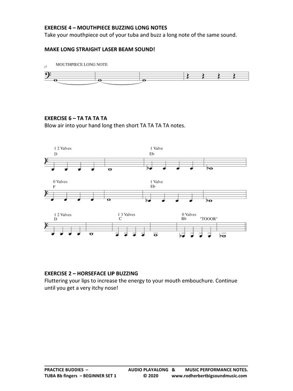 PRACTICE BUDDIES - TUBA Bb Fingers  - BEGINNER - SET 1 - AUDIO PLAY-ALONG MP3 AND MUSIC NOTES